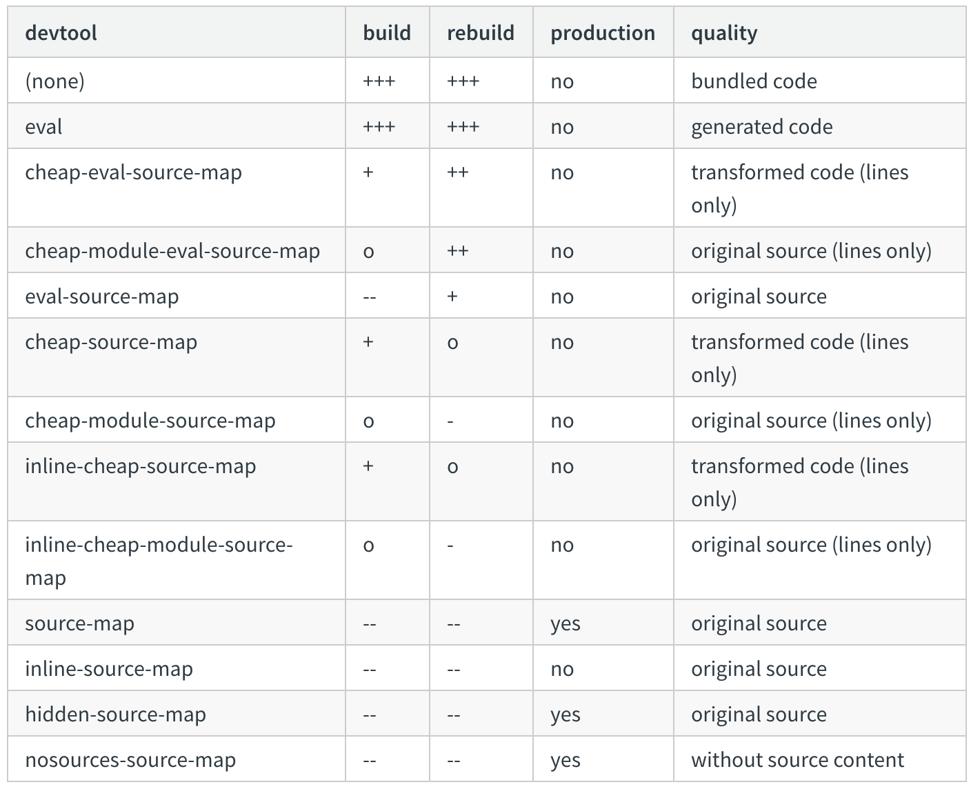devtool 主要是给 JS 文件添加对一个的 sourceMap 文件。不过,webpack 可以生成多种 sourceMap 文件,具体的区别是,映射还原度的区别。这里直接参考 webpack 官方文档即可。